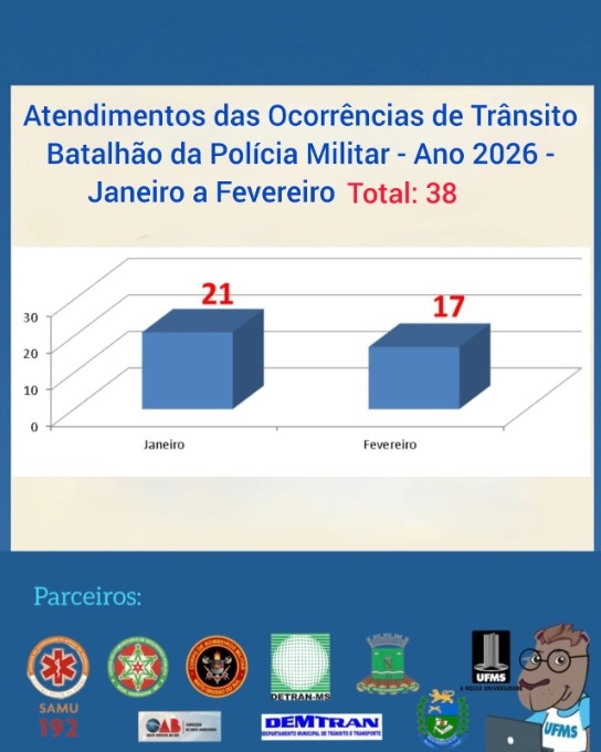 Os atendimentos relacionados a ocorrências de trânsito em Nova Andradina somaram 38 registros nos dois primeiros meses de 2026, conforme levantamento do “Monitor de Violência no Trânsito em Nova Andradina” disponibilizado pelo 8º Batalhão da Polícia Militar (8ºBPM). Os dados apontam 21 ocorrências em janeiro e 17 em fevereiro, demonstrando leve redução no segundo mês do ano.