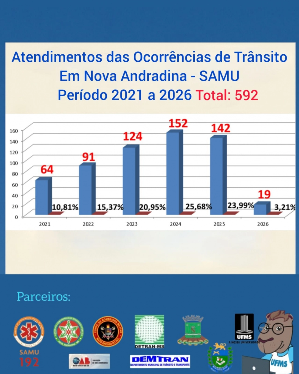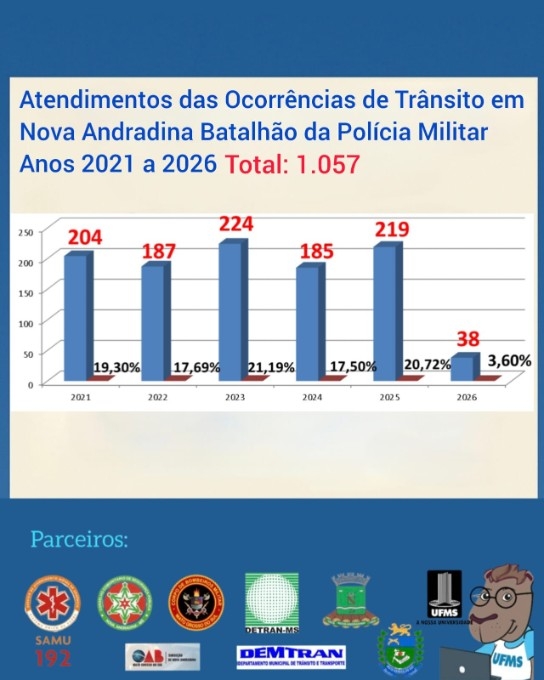 O levantamento também apresenta um panorama dos atendimentos realizados pela Polícia Militar em Nova Andradina entre 2021 e 2026, totalizando 1.057 ocorrências de trânsito no período.