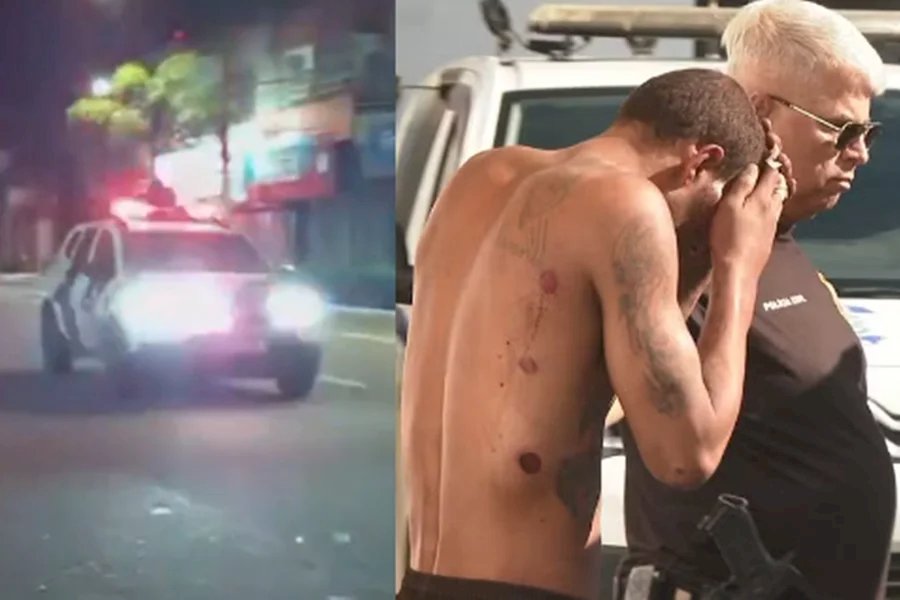 Os policiais chegaram a acelerar na tentativa de fazê-lo se soltar, mas ele seguiu agarrado por cerca de 800 metros. O homem só caiu após reforço policial, no Centro. A contenção só foi possível após o uso de balas de borracha.